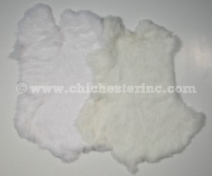 Rabbit Skin PicturesBleached WhiteThe photos below have been taken under the same lighting conditions. The bleached white skins have been bleached to whiten them--see the first row of pictures. The second row is our regular, very nice white rabbits that have not been bleached. The unbleached white skins always have a slight creaminess to them compared to the bleached ones. Because they are alum tanned, our regular white skins are some of the whitest on the market. The third row shows a comparison between the bleached skins and regular white ones. The comparison photos show how bright the bleached skins are. Our regular white skins are very white and clean compared with what comes from most tanneries. The last row shows the back side of the bleached white skins. Click on any photo for a larger view. Bleached White Garment Grade Skins