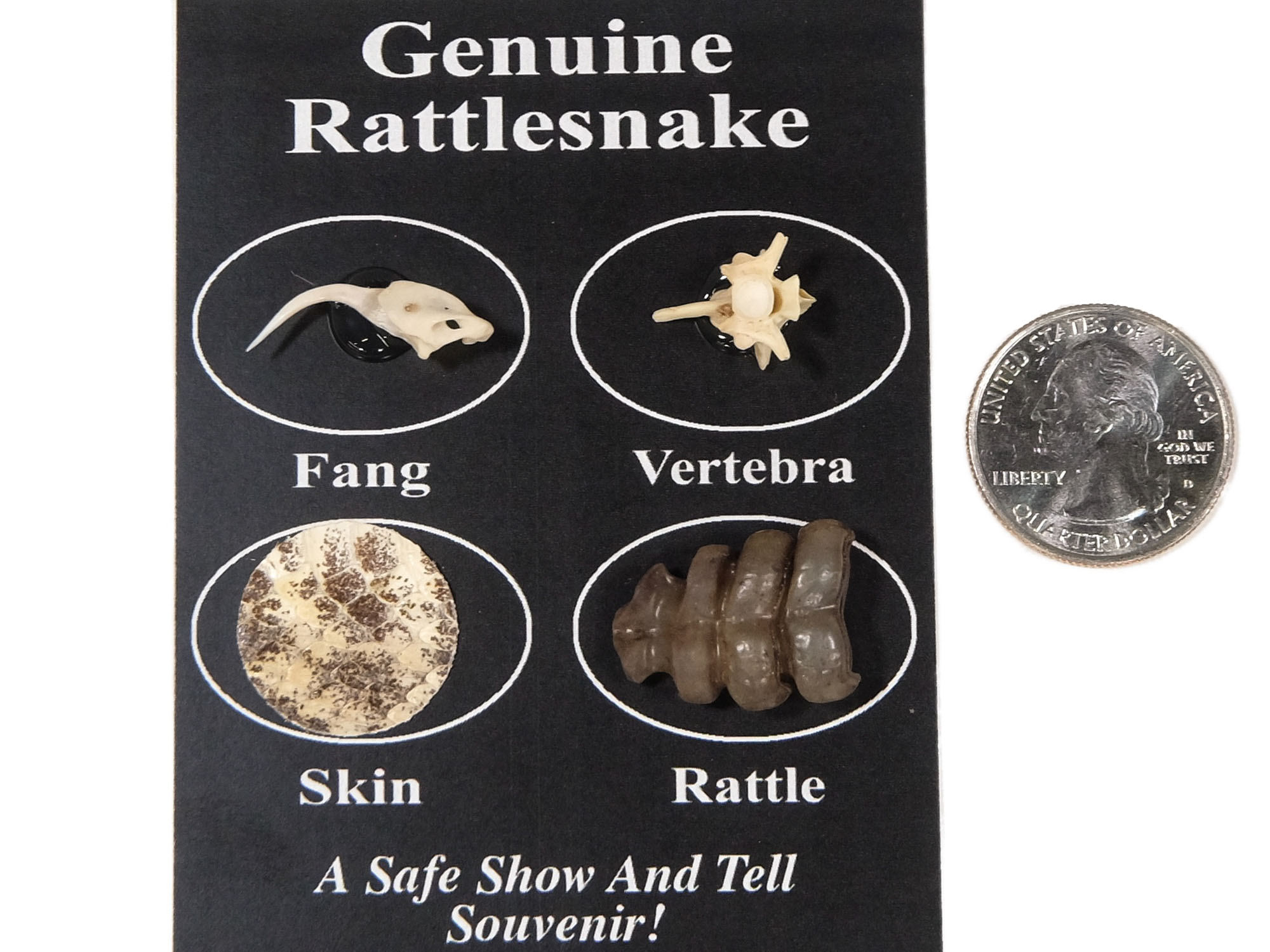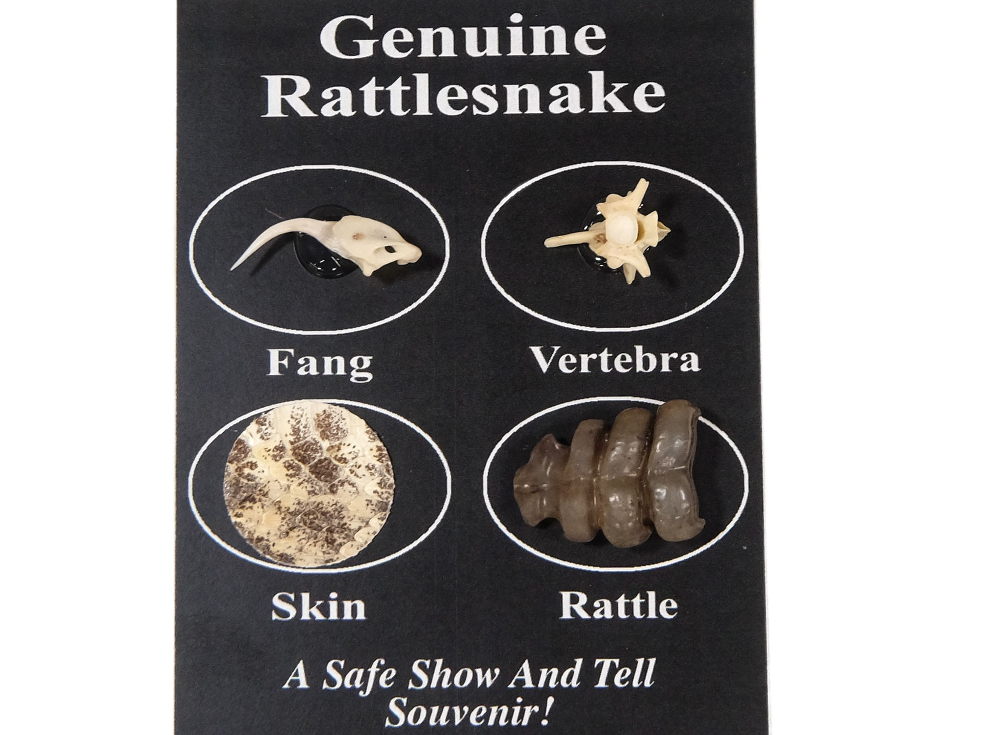 This is a nice souvenir of assorted real Texas Western or Eastern diamondback rattlesnake parts. One piece each of rattlesnake fang, bone, skin, and rattle is mounted on a cardboard backing that measures 4" long and 2.75" wide. Each pack weighs approximately 0.1 oz.
