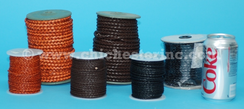 This 4 strand round braid, sometimes referred to as bolo cord, is used for trim and many types of jewelry. It is made from dyed and waxed cotton cord. It is hand braided around a cord to prevent stretch. It comes in two widths and is put up on 25-yard (75 foot) spools. The 3 mm spools weigh ~4-5.5 oz. The 5mm spools weigh ~1-1.2 lbs.