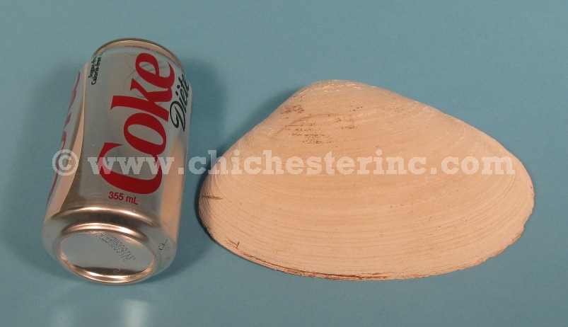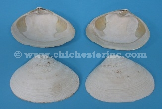 The Atlantic surf clams are native to the northeast coast of the United States. The shells have been shucked and cleaned in cold water. These measure about 4" to 7" long by 3" to 5" wide. One shell weighs 100 grams.