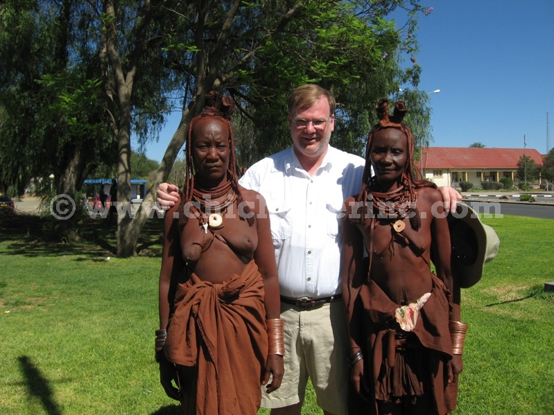 Welcome to Namibia--driving into the country from northwest South Africa. Eggs in climate-controlled vermiculite. The concrete ponds where the crocs start growing. Crocs running for cover when the owner and I approached. Oh my gosh--people!!! These tanks are normally off limits to avoid scaring the crocs. The bigger crocs are not afraid of us in the least--we're tasty.... Paul Crosby with two Himba women in town. |
